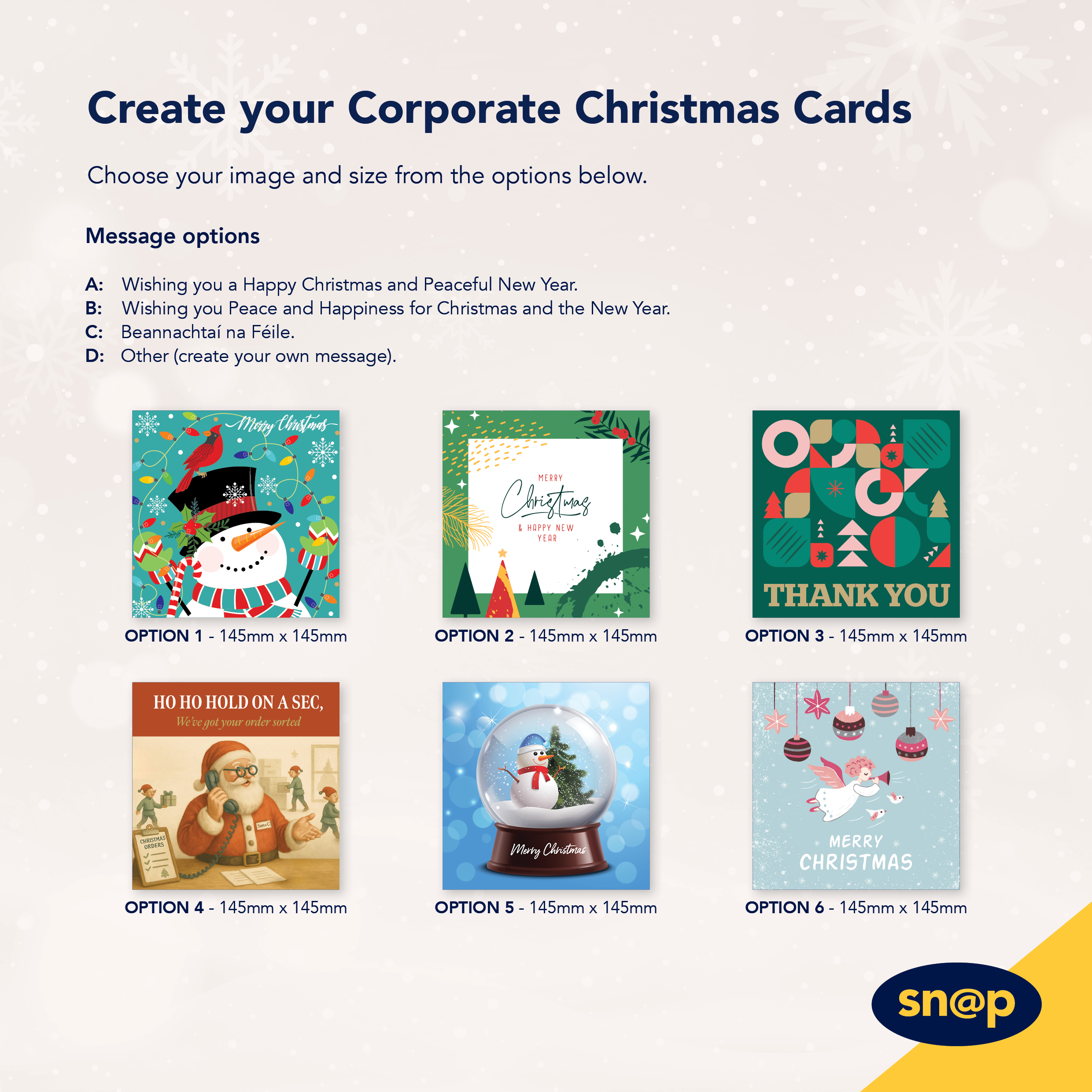 When you have chosen a design, we will customise the Christmas cards with your company logo and a personal message from as few as 50 cards. View our range of card designs in our downloadable brochure here :